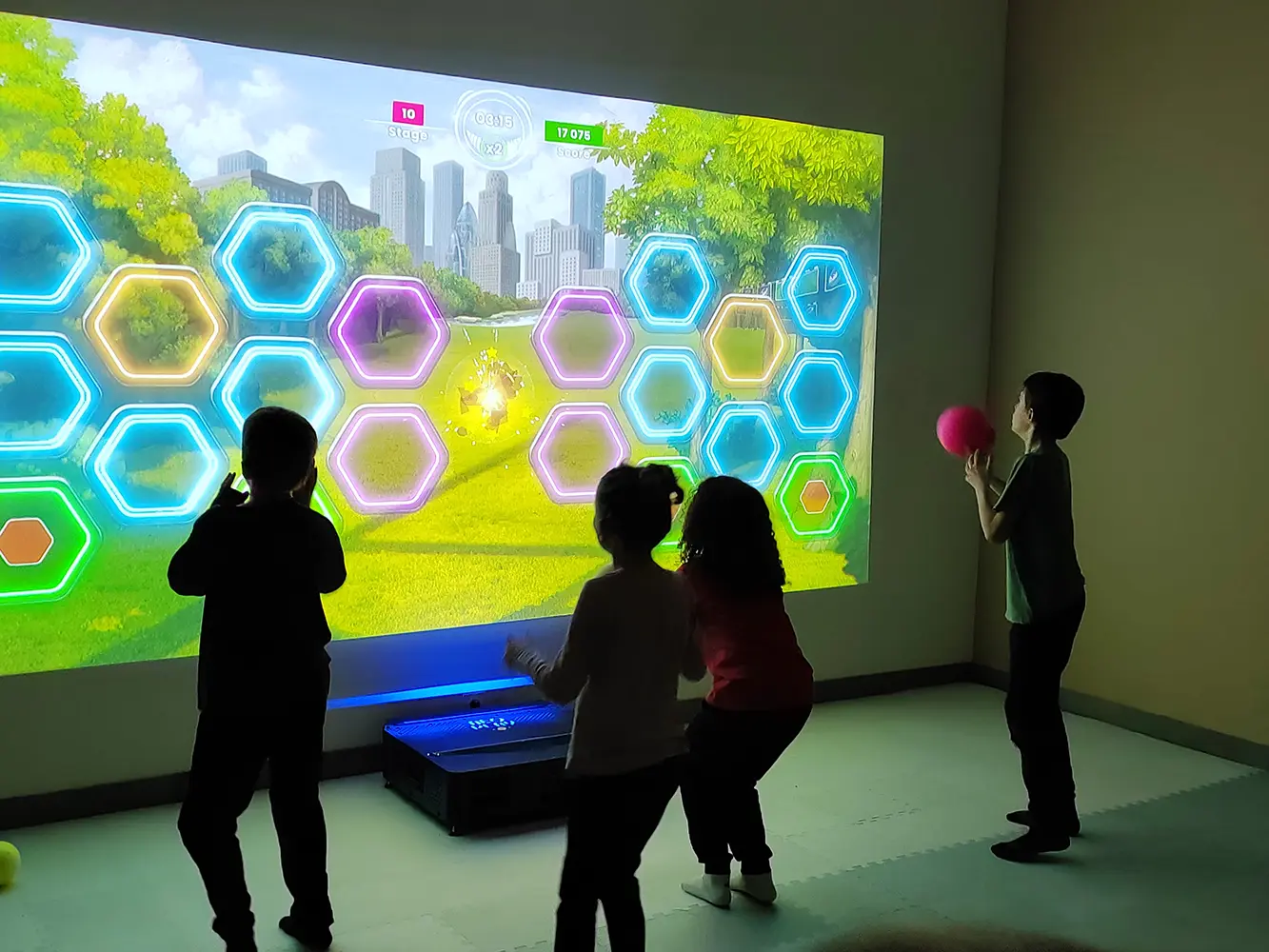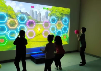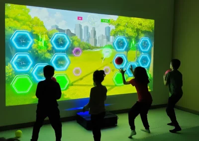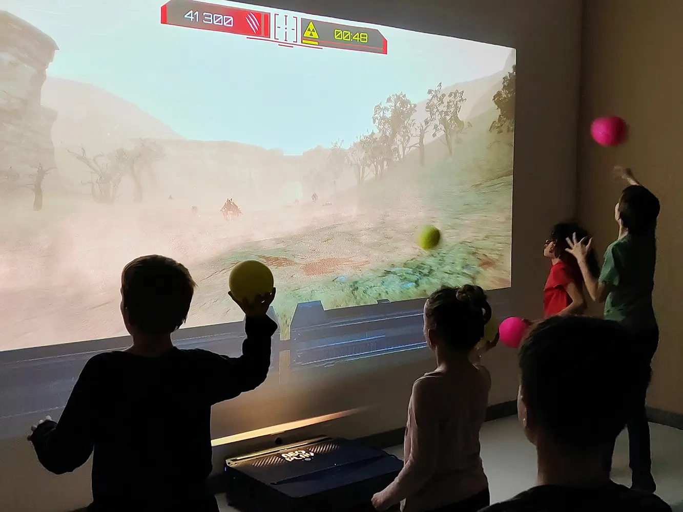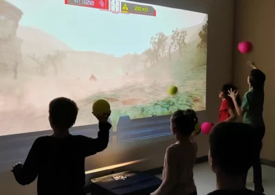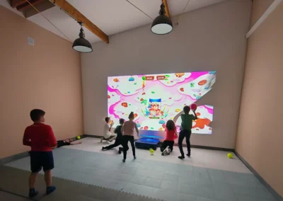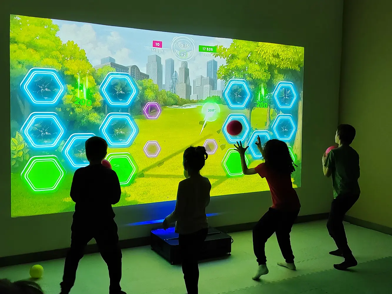 Grâce à un vidéo projecteur, un espace vide devient un terrain de jeux pour petits et grands. Des capteurs de mouvement rendent l’expérience entièrement interactive pour chacun des joueurs.